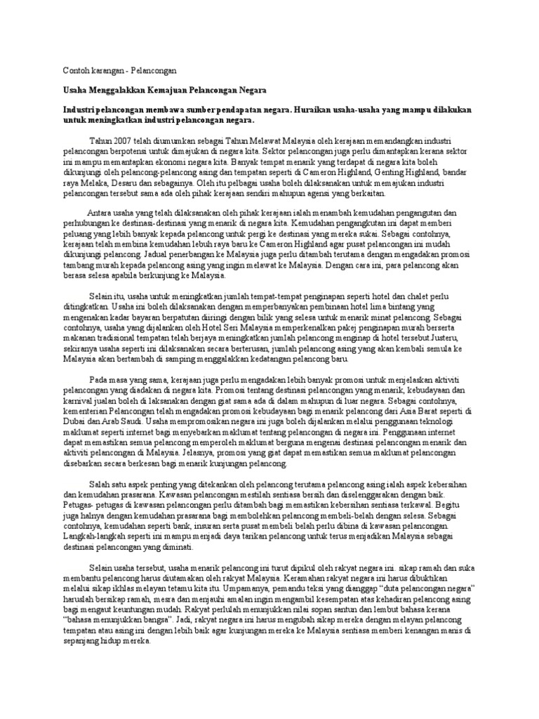 Kemukakan usaha-usaha yang perlu dilakukan untuk menggalakkan kedatangan para pelancong ke Malaysia. Contoh Karangan SPM Industri Pelancongan Kesihatan Di Malaysia. Penutup Karangan Kebaikan Melancong Dalam Negara.